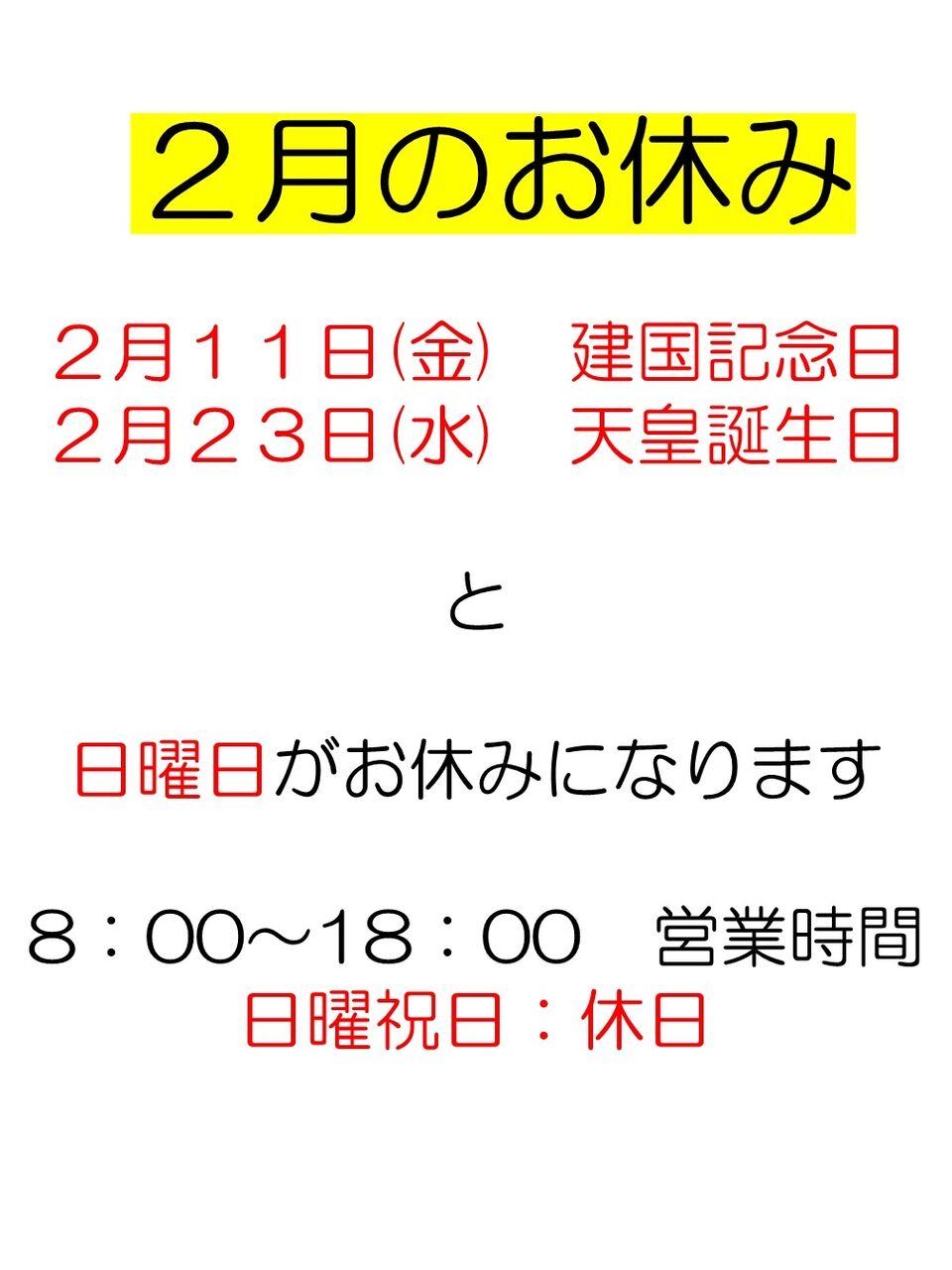 2月の営業予定